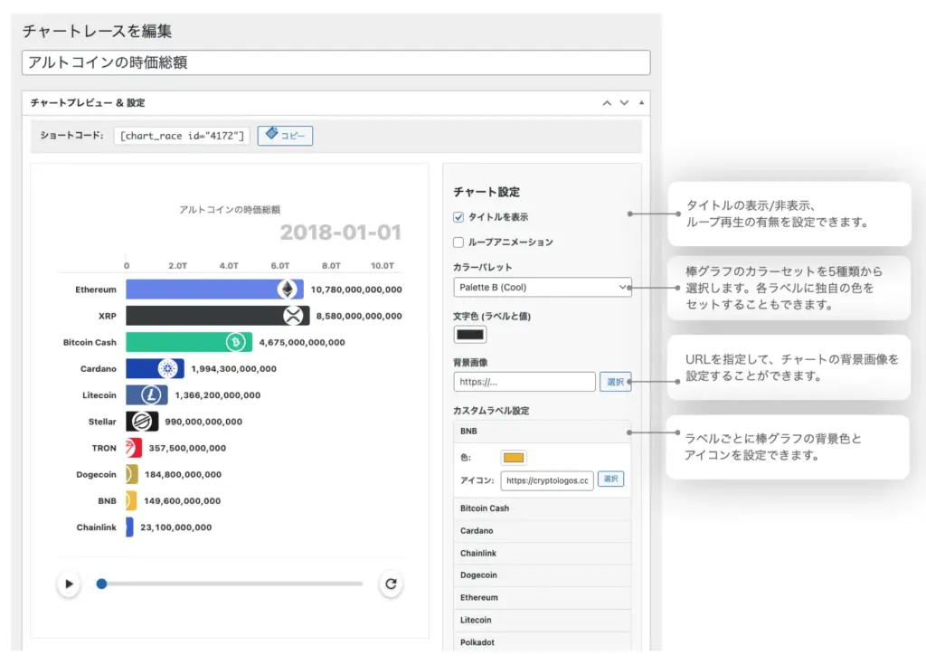 「Bar Chart Race Pro」は、順位がリアルタイムに入れ替わるアニメーショングラフを簡単に作成できる高機能なチャートプラグインです。