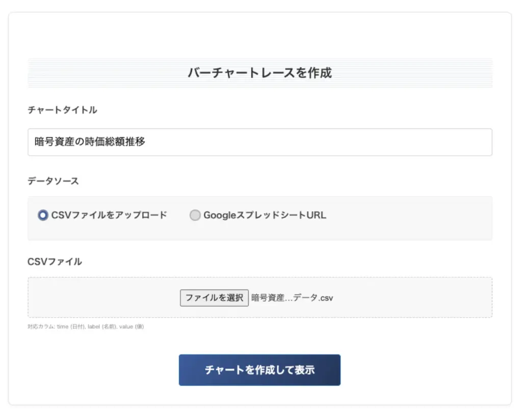 ・GoogleスプレッドシートURL: Googleスプレッドシートと連携する場合。 - ファイルを選択、またはURLを入力して「チャートを作成」ボタンを押してください。