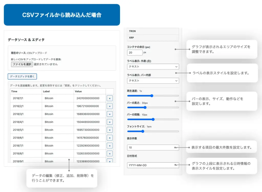 | 機能の概要 | このショートコードを固定ページに設置すると、CSVアップロードフォームが表示されます。 ユーザーがファイルをアップロードすると、自動的にその場でバーチャートレースが生成され、再生されます。 社内ツールや、デモンストレーション用として活用できます。 |