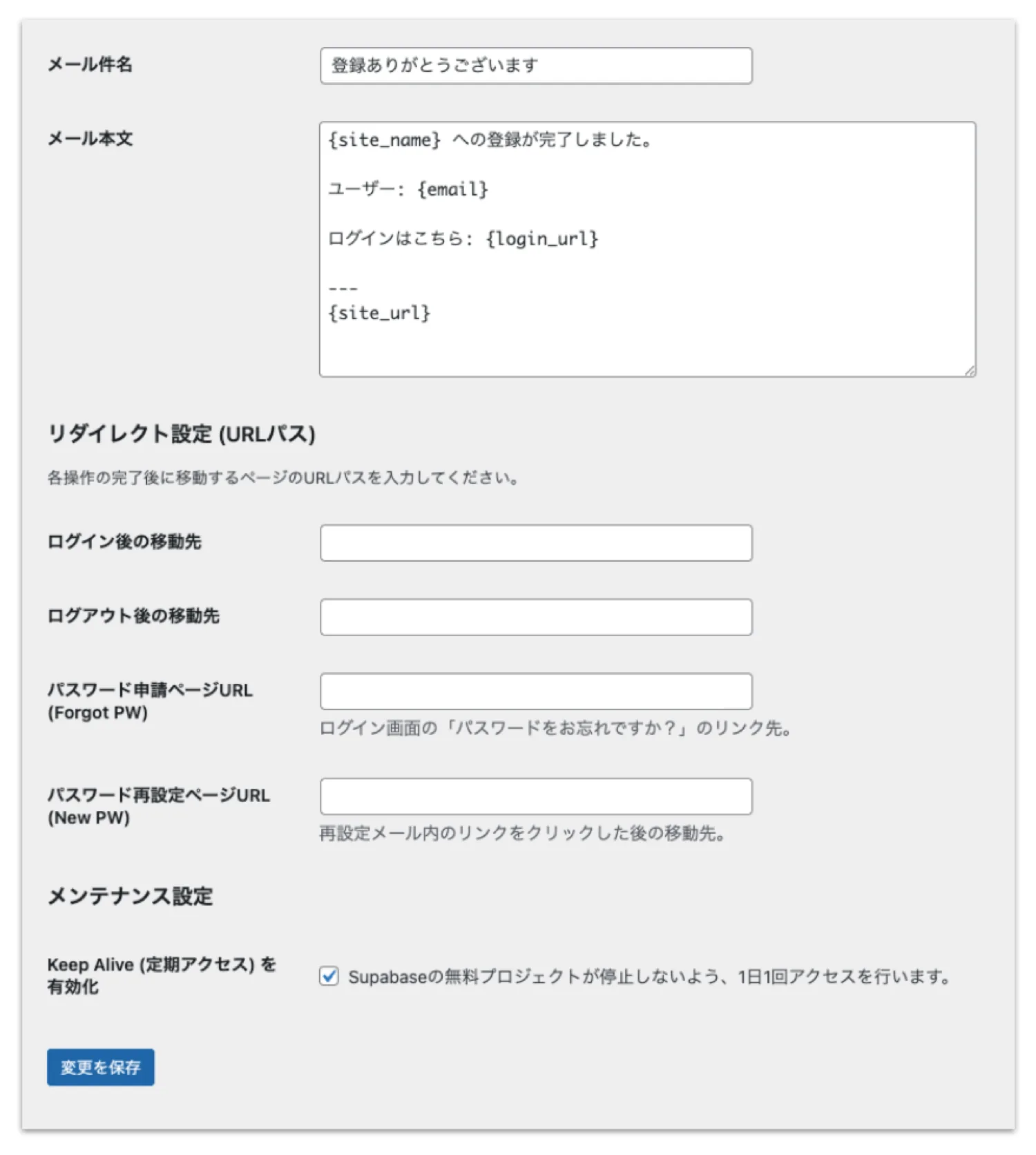 そこで、プラグインに「Keep Alive」機能を搭載しました。 これをONにしておけば、WordPressが1日1回、自動的にSupabaseへアクセスを行い、プロジェクトの停止を防ぎます。地味ですが、運用者には涙が出るほどありがたい機能はずです。